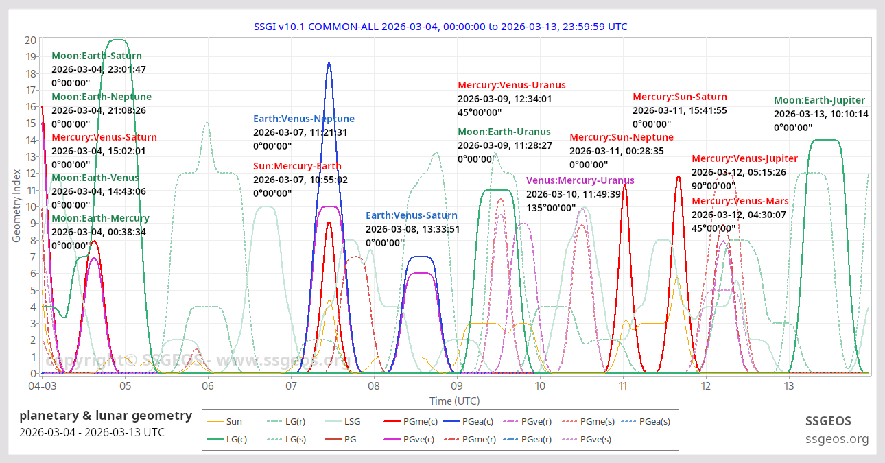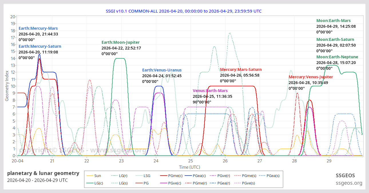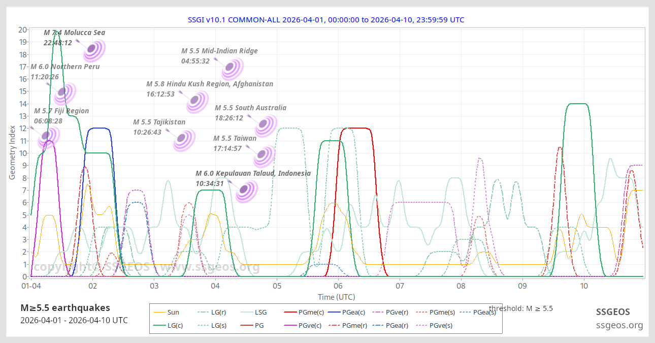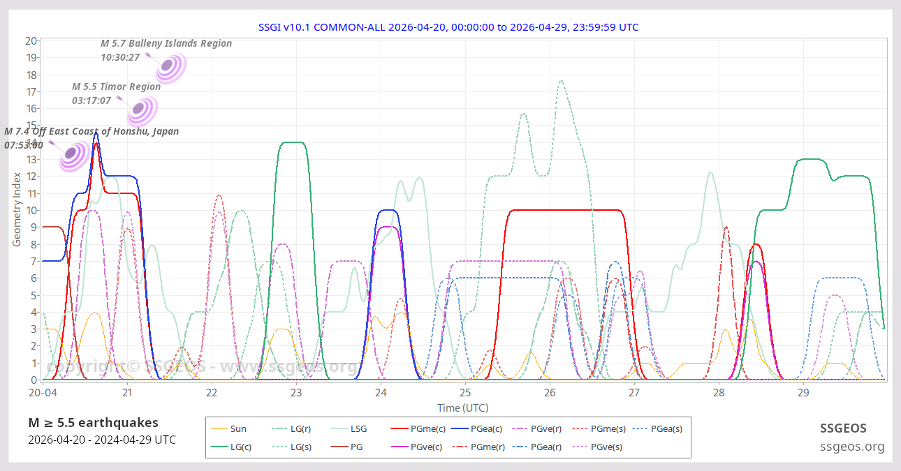 The Solar System Geometry Index (SSGI) is an indicator for anticipating large(r) seismic activity. See a brief explanation here. Examples of the SSGI and larger earthquakes are in the earthquake reports section.