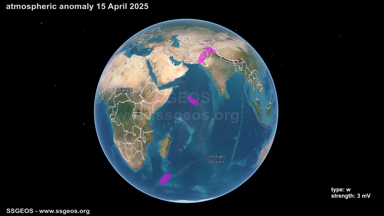 We measure electric charge in the atmosphere near sea level to detect anomalies that may indicate impending seismic activity in specific regions in the world. Estimated regions are marked at a thin line, which is perpendicular to the plane of the ecliptic. The strength of an anomaly indicates seismic potential whereby 2.0-2.5 mV ≤ M 6 (strong), and 3.0-5.0 mV ≥ M 7+ (major) approximately. Actual seismic activity depends on local tectonic stress levels, which is an unknown factor. There is no guarantee that a larger earthquake will occur.
