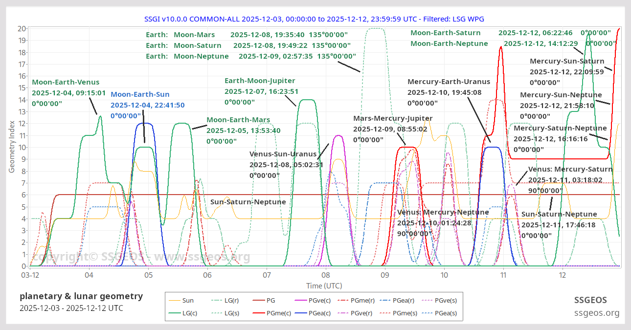 The Solar System Geometry Index (SSGI) is an indicator for anticipating large(r) seismic activity. See a brief explanation here. Examples of the SSGI and larger earthquakes are in the earthquake reports section.