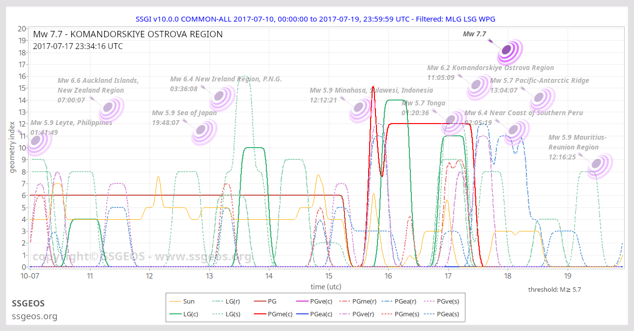 In August 2021, with Solpage version 7.4, the SSGI COMMON graph has been revised. Instead of red peaks for all critical planetary geometry (PG), different colors are now used to mark geometry involving Mercury (PGme), Venus (PGve) and other planets (PG). Visualization of the involvement of Mercury and Venus is important, as convergence of critical planetary geometry with these two planets account for most of the major earthquakes. This conclusion is based on nine years of research.