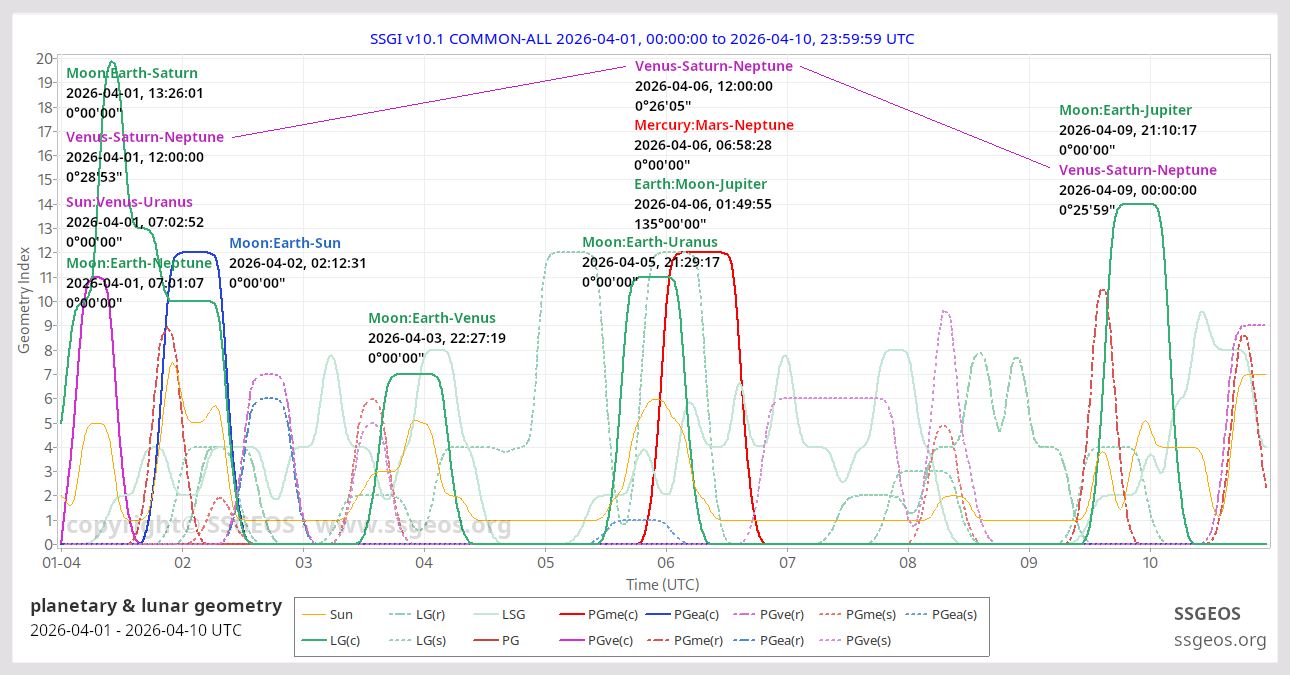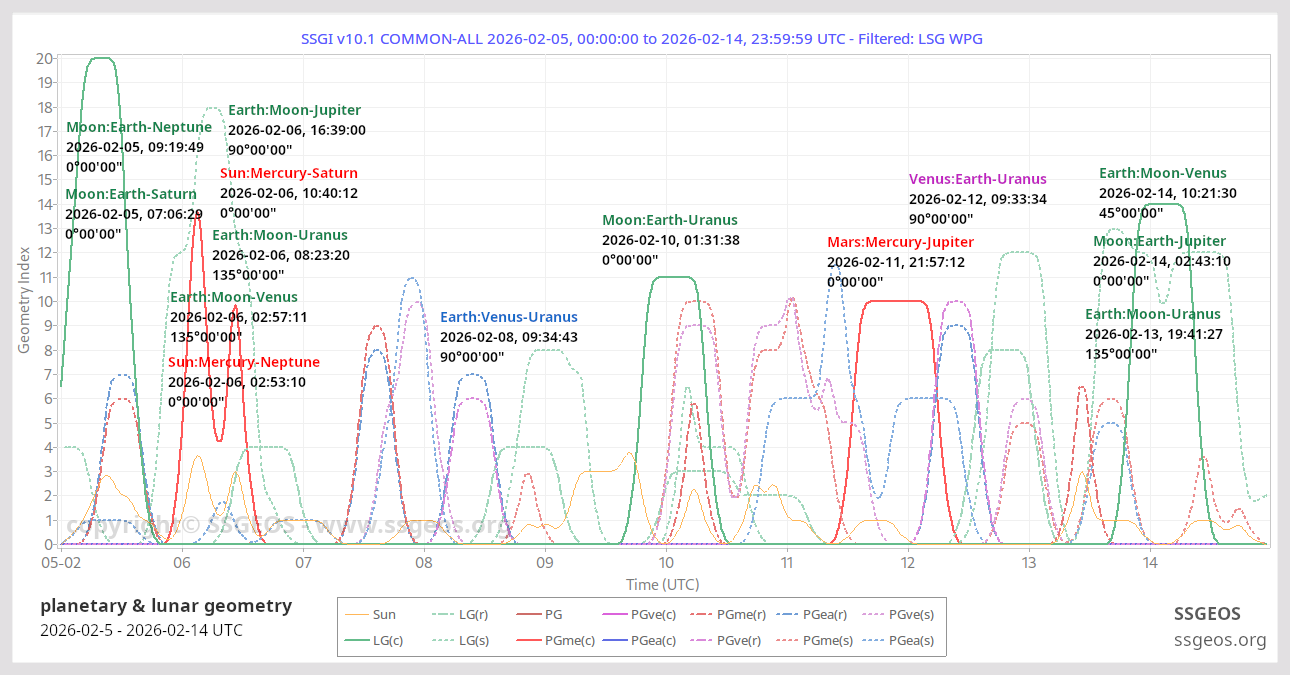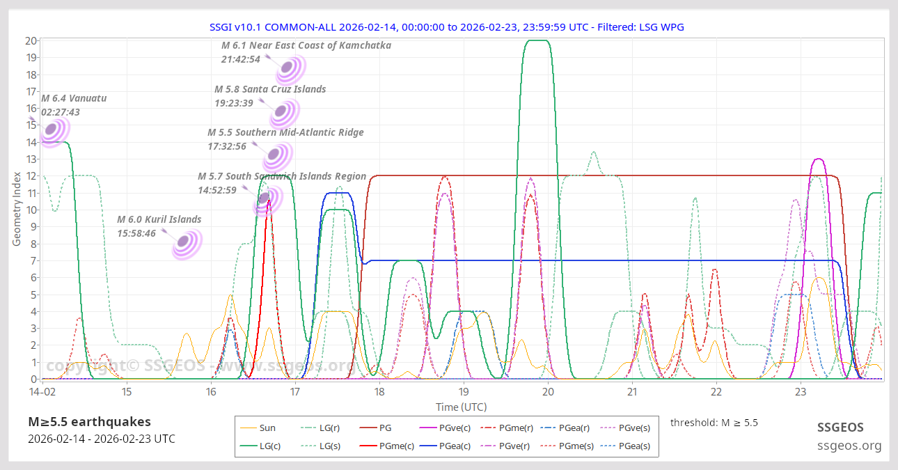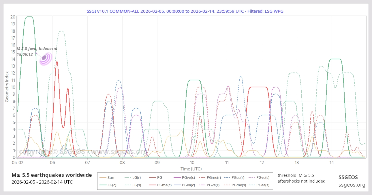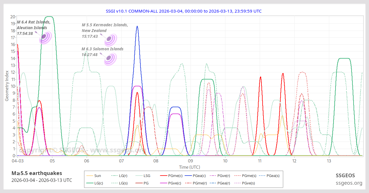 The Solar System Geometry Index (SSGI) is an indicator for anticipating large(r) seismic activity. See a brief explanation here. Examples of the SSGI and larger earthquakes are in the earthquake reports section.