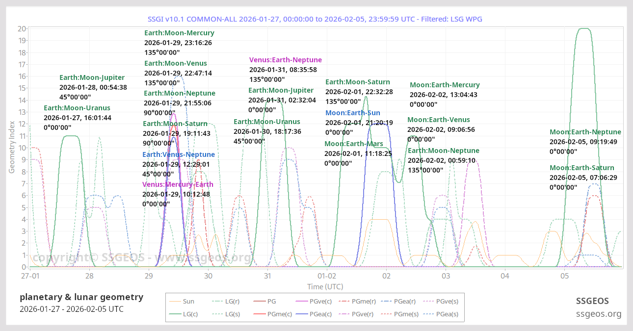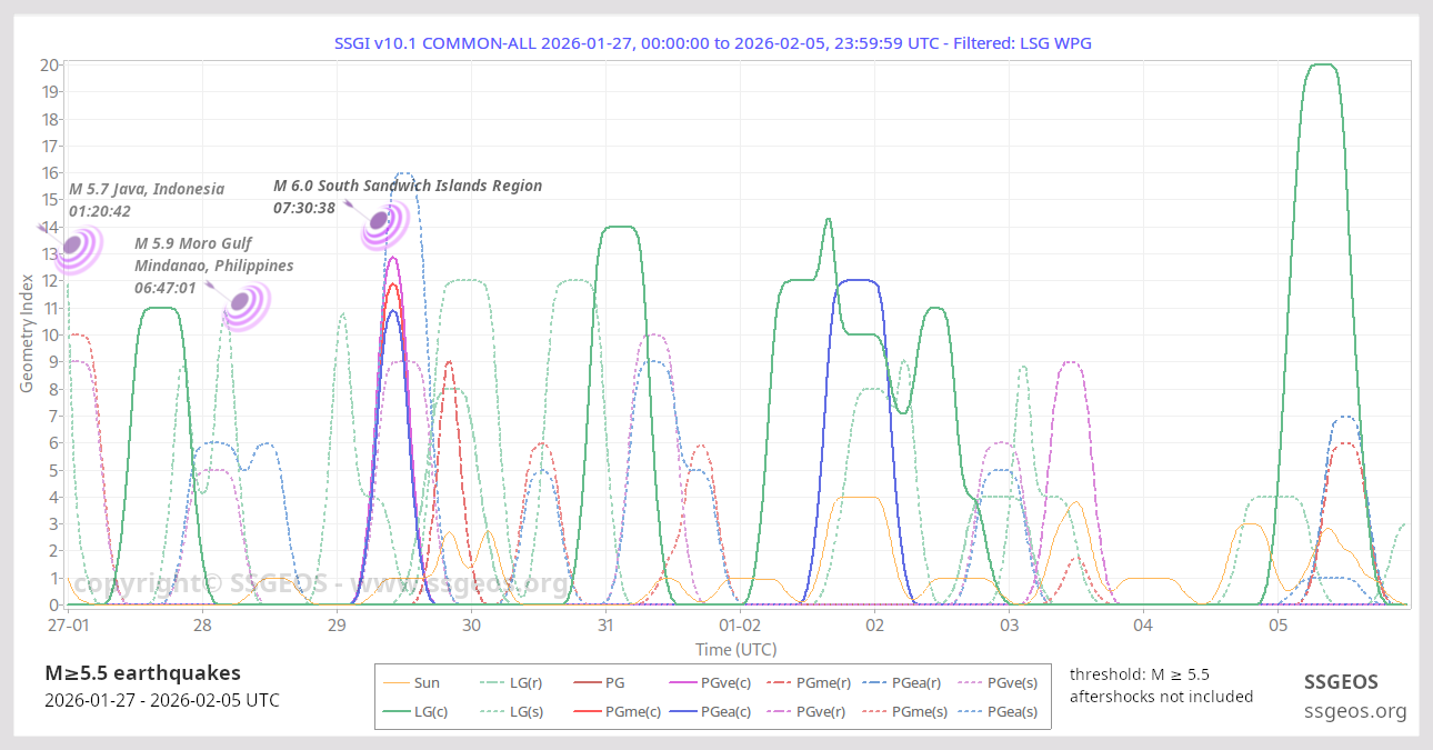 The Solar System Geometry Index (SSGI) is an indicator for anticipating large(r) seismic activity. See a brief explanation here. Examples of the SSGI and larger earthquakes are in the earthquake reports section.