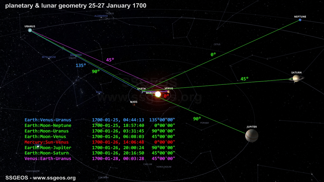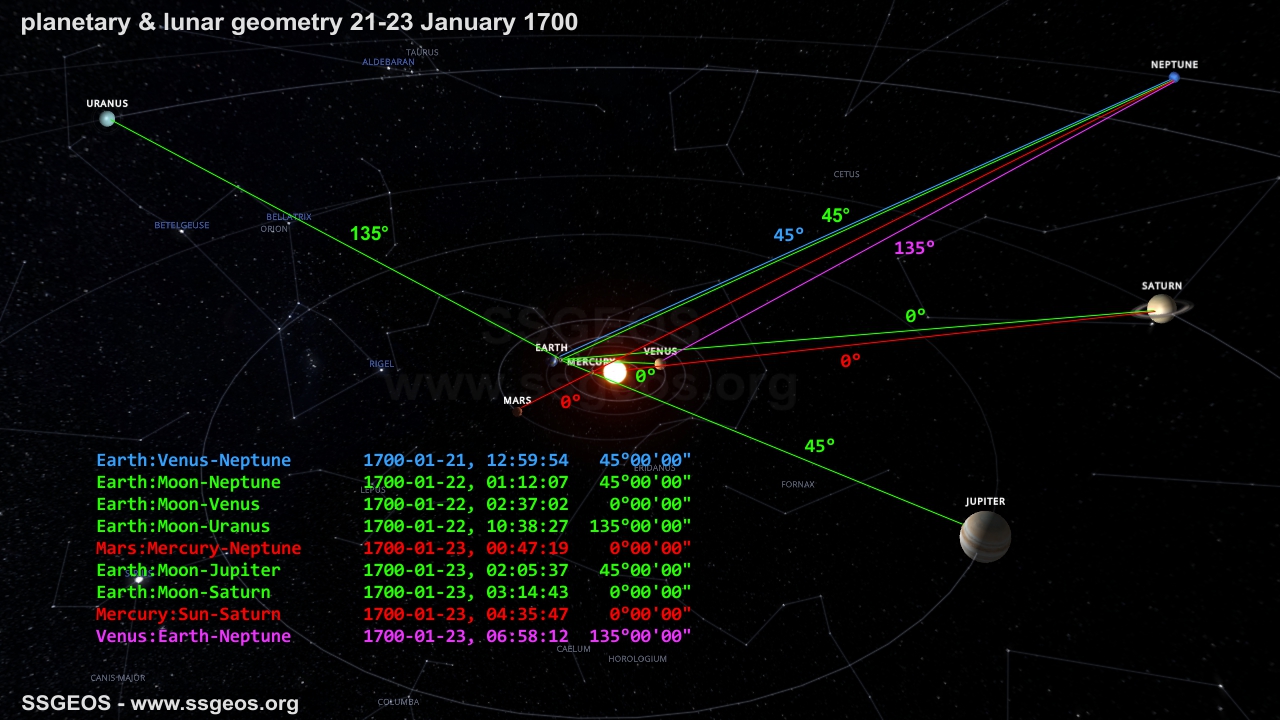 Earth:Venus-Neptune 1700-01-21, 12:59:54 45°00'00" Earth:Moon-Neptune 1700-01-22, 01:12:07 45°00'00" Earth:Moon-Venus 1700-01-22, 02:37:02 0°00'00" Earth:Moon-Uranus 1700-01-22, 10:38:27 135°00'00" Mars:Mercury-Neptune 1700-01-23, 00:47:19 0°00'00" Earth:Moon-Jupiter 1700-01-23, 02:05:37 45°00'00" Earth:Moon-Saturn 1700-01-23, 03:14:43 0°00'00" Mercury:Sun-Saturn 1700-01-23, 04:35:47 0°00'00" Venus:Earth-Neptune 1700-01-23, 06:58:12 135°00'00" Earth:Venus-Uranus 1700-01-25, 04:44:13 135°00'00" Earth:Moon-Neptune 1700-01-25, 18:57:40 0°00'00" Earth:Moon-Uranus 1700-01-26, 03:31:45 90°00'00" Earth:Moon-Venus 1700-01-26, 06:08:03 45°00'00" Mercury:Sun-Venus 1700-01-26, 14:06:48 0°00'00" Earth:Moon-Jupiter 1700-01-26, 20:00:24 90°00'00" Earth:Moon-Saturn 1700-01-26, 20:16:50 45°00'00" Venus:Earth-Uranus 1700-01-28, 00:03:28 45°00'00"