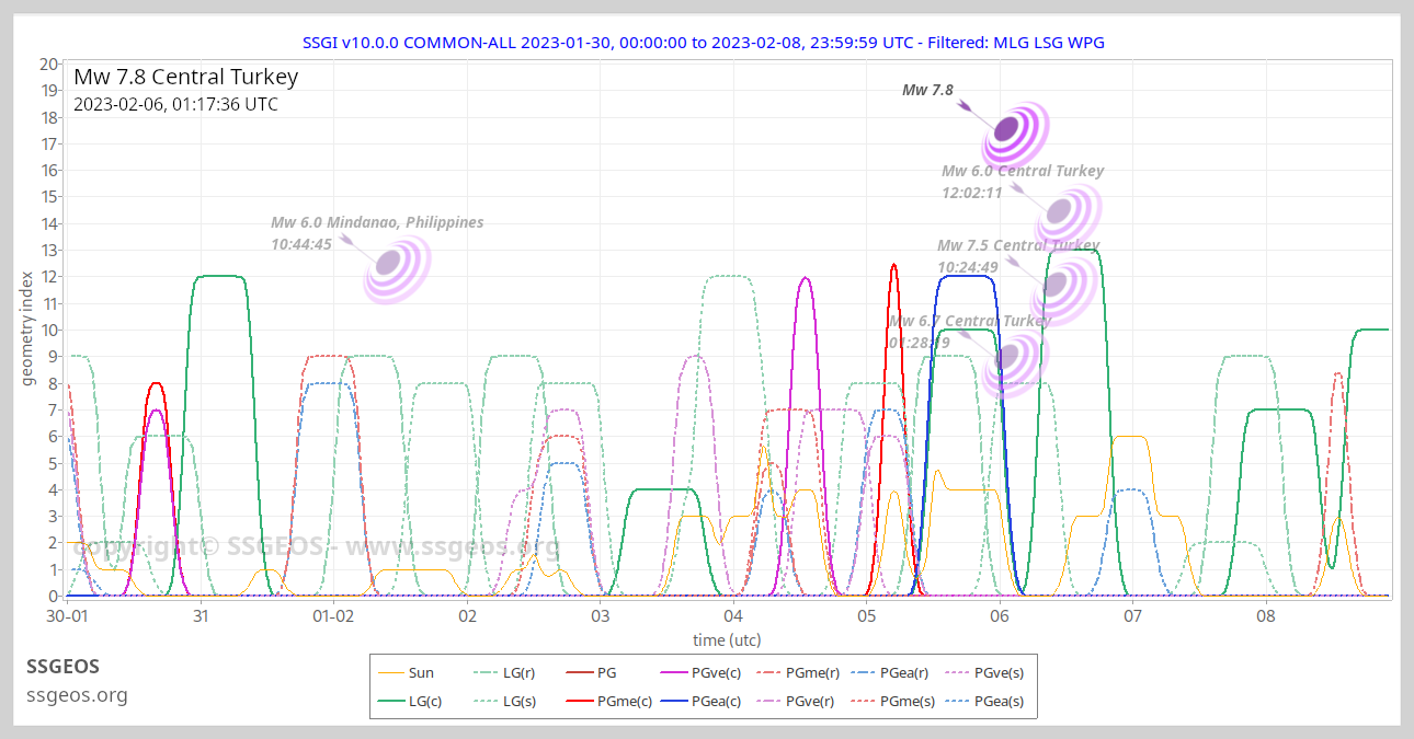The geometry is depicted on the SSGI COMMON graph as a red (Mercury), purple (Venus), blue (Earth) or green (Moon) peak, whereby solid lines are conjunctions (c = 0°, 180°), dashed lines are right angles (r = 90°) and dotted lines are semi-right angles (s = 45°, 135°). The range of planetary peaks is defined by a ~0.20° tolerance and lunar peaks by a ~3.0° tolerance because of the Moon's higher orbital velocity. Stronger electromagnetic force occurs when indicated geometry converges in time, which typically results in short-term clusters of earthquakes with magnitude ≥ 5.5. It explains the phenomenon of temporal clustering of stronger earthquakes (not to confuse with spacial clustering). See also Geometry and Dynamics of the Solar System for more information about the geometry emphasized in our models.